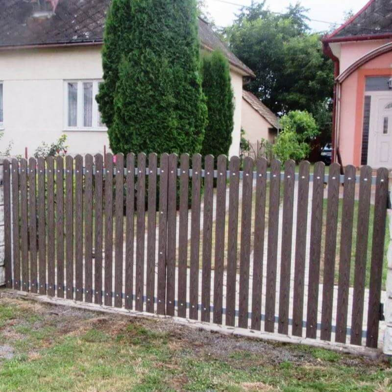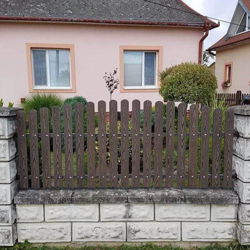 Műfából készült íves tetejű kerítéselemek. (WPC=Wood Plastic Composite) – a körnezetre ártalmatlan hőre lágyuló polipropilén és fafűrészpor kombinációja (60% természetes farost + 40 % polipropilén). A termék extrudálással készül, ahol az alkatrészeket magas nyomáson és magas hőmérsékleten kezelik. A kezelések során az anyagok vegyi és fizikai jellegében jelentős változások mennek végbe.