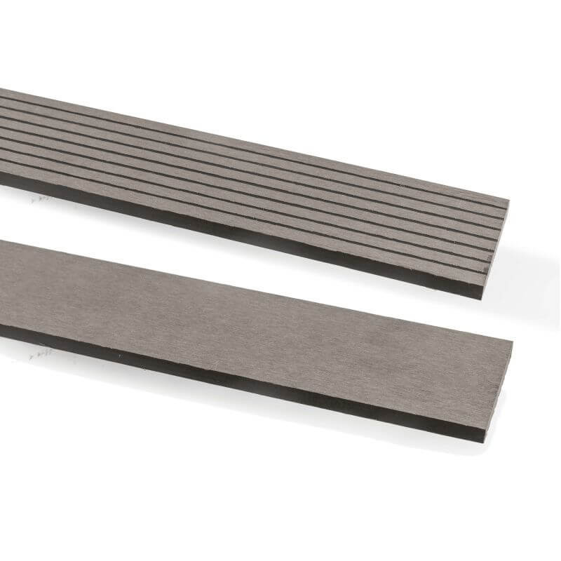 Műfából készült sík tetejű, szürke kerítéselemek. (WPC=Wood Plastic Composite) – a körnezetre ártalmatlan hőre lágyuló polipropilén és fafűrészpor kombinációja (60% természetes farost + 40 % polipropilén). A termék extrudálással készül, ahol az alkatrészeket magas nyomáson és magas hőmérsékleten kezelik. A kezelések során az anyagok vegyi és fizikai jellegében jelentős változások mennek végbe.